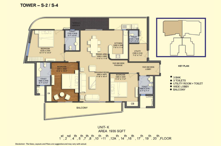 Flat Sizes 3BHK 1425, 1935, 2080 Sq. Ft